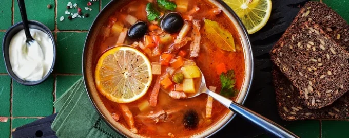 - Solyanka prefabrykowana jest gotowa – wystarczy ją tylko zdjąć z ognia i odstawić na 10-20 minut. Można podawać z koperkiem i kwaśną śmietaną.